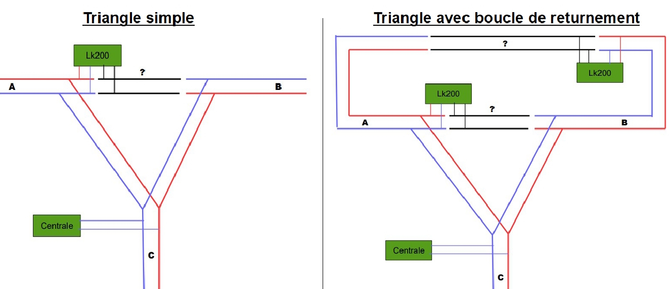 6) Le triangle de retournement. Selon les plans de réseaux , il existe plusieurs cas de figure. La boucle peut servir à retourner un engin moteur, ou à aiguiller un train sur différentes parties section du réseau ce qui détermine la longueur de la section isolée. De plus deux branches du triangle peuvent aussi aboutir à une boucle de retournement. La zone isolée doit être supérieure à l'empattemet du train le plus long sauf si cette boucle sert à retourner un engin moteur. Dans ce cas c'est l'empattement de l'engin moteur le plus long qui compte.