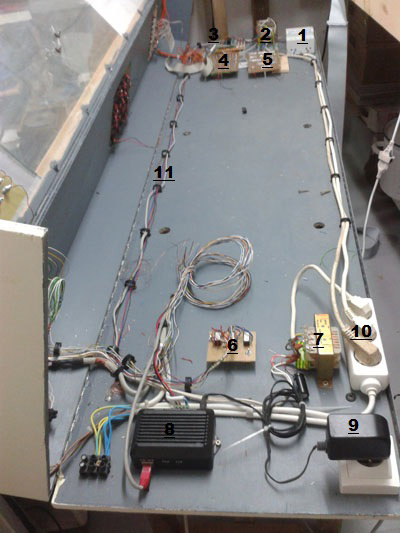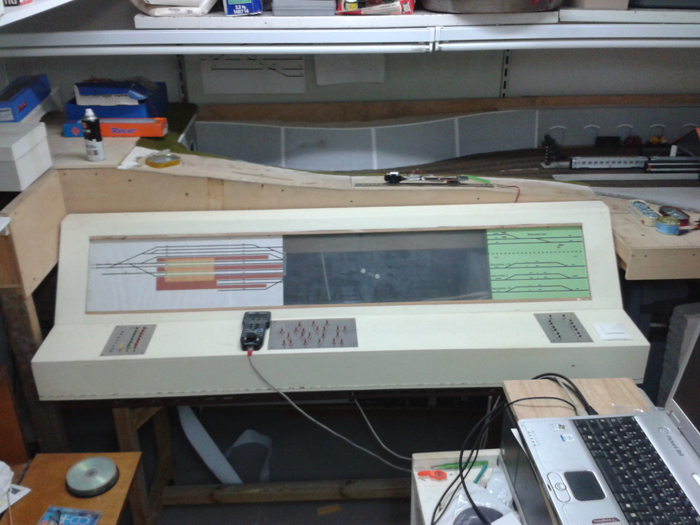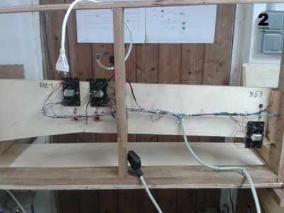 A gauche l'intérieur du TCO que j'ai suffisamment dimensionné pour recevoir tous les éléments utiles à la bonne gestion du réseau. Il me reste à achever le travail. Photo N°1 : la ligne DCC en 2 x 1.5 avec le piquage pour les voies de la remise à autorails. Rien de plus |