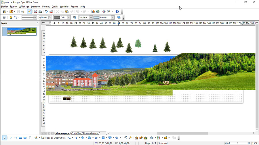 Résultat final, votre ciel est parfait. A l'échelle 1 après impression votre champ de vision ne permet pas de voir la répétition du motif. Avec cette méthode vous pouvez créer un paysage de campagne, un paysage urbain (mon cas) une forêt, etc... Bon a savoir, on peut stocker hors page des images en attente d'utilisation. Voir en dessous ma page de travail lors de la création de la dernière tranche de mon diorama. En bas un garage en attente d'intégration, en haut des sapins en attente. |