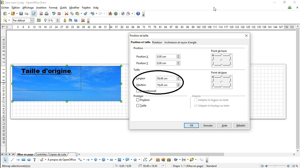 2) Insérer une image et nous importons notre ciel inversé. Dans sa boite de dialogue position et taille vous renseignez les démentions copiées du ciel normal, puis vous mariez les deux images. Pour un mariage parfait, ne pas hésiter à zoomer gros. Enregistrer après cette étape. |