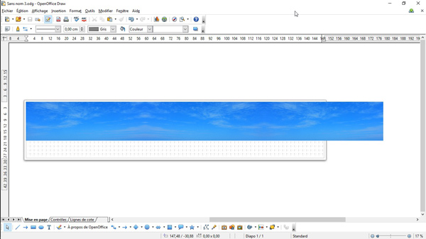 1) Sur votre page blanche : insérer une image et vous placez votre ciel en haut à gauche. Vous l'étirez à votre convenance et vous prenez note des dimensions. |