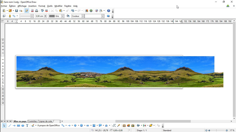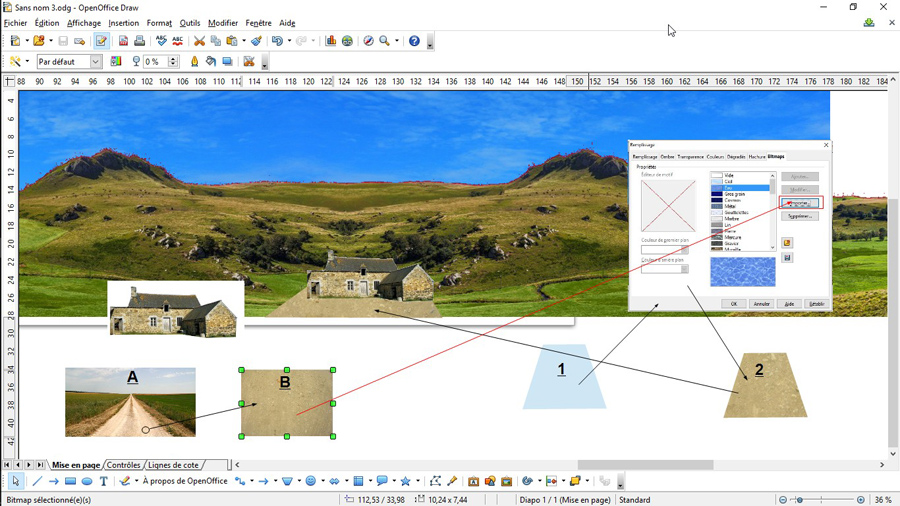 Vous venez de voir dans les chapitres précédents comment à partir de photos faire un ciel dans un dessin Open Office et comment modifier une image avec Paint de façon à pouvoir en faire disparaître certaines parties dans Open Office avant de l'utiliser pour compléter notre diorama. Vous avez donc un ciel et un paysage de campagne que vous allez meubler. Cette page ainsi que les précédentes sont rédigées uniquement à titre d'exemple pour vous montrer comment je fais. Plaçons un village : Et voila votre village est en place. Vous allez placer une ferme au bord de la rivière. 1) Toujours avec Google vous cherchez une ferme qui vous plaît. Celle ci sur fond blanc n'a pas besoin d'être retravaillée avec Paint. Vous la plaçez sur votre feuille Open Office, avec l'outil pipette vous vous débarrassez du blanc par étapes successives : tolérance à 10% puis à 15 et ainsi de suite pour en avoir le moins possible. 2) Faire une couleur bitmaps. La cour est faite à partir d'un objet trapèze 1 dontvous vous débarrassez du cadre (option ligne sur aucun). Vous allez maintenant le remplir avec de la terre. Dans Google vous cherchez un chemin A qui vous plaît. Avec Paint (fonction sélectionner puis rogner) vous en sélectionnez un petit morceau dans le cercle que vous multipliez avec copier/coller pour obtenir le résultat B. Ensuite dans la boite de dialogue remplissage choisir importer. Vous importez votre image B, la baptisez et le tour est joué. Votre trapèze 2 est rempli. Il ne reste plus qu'a tout mettre en place, la cour puis la ferme par empilement. Enregistrer et enregistrer dans la sauvegarde. La méthode pour faire des bitmaps est utile pour toutes les textures dont vous avez besoin : herbe, revêtement routier, crépi, etc...