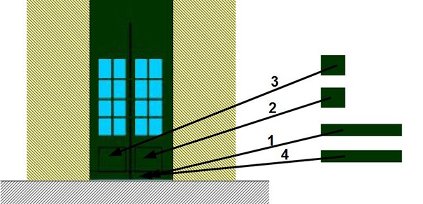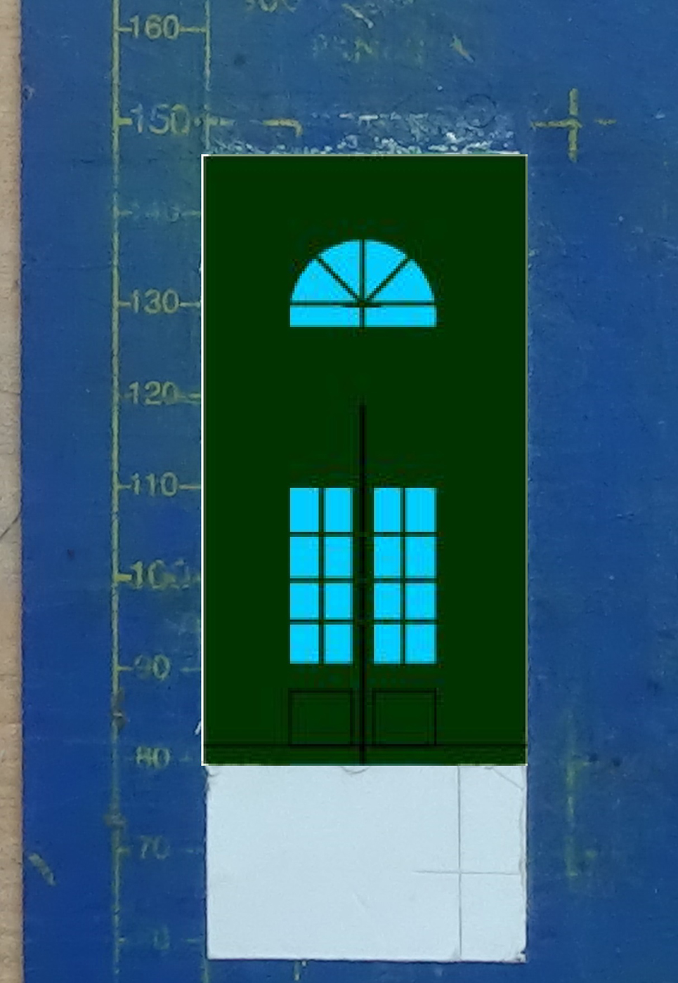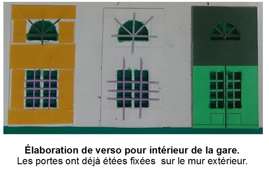 Une fois que ma porte est mise en place sur le bâtiment par collage à la colle à bois, je mets en place le bas de porte découpé dans la bande verte imprimée. Ce bas de porte qui lui aussi est collé est constitué de 4 pièces.