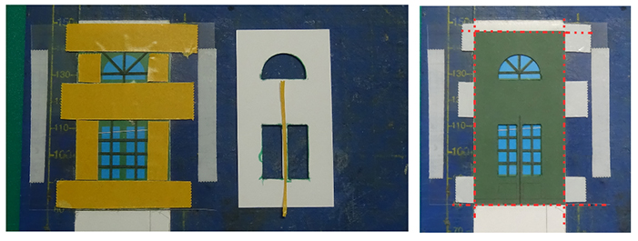 Je dessine avec l’option dessin de mon traitement de texte Open Office une porte maître et des portes secondes. Le tout est imprimé sur du papier Canson 120gr. Je découpe la porte maître que je fixe solidement avec le double face sur mon tapis de coupe. La bande verte est prévue pour faire les reliefs en bas de la porte.