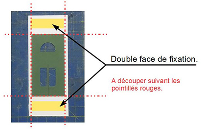 Puis je mets en place la porte sur la vitre. L’intérêt du double face pour moquette est qu’il est très solide et qu’à la différence de la colle aucune coulure est à craindre. Et en fin je découpe suivant les pointillés. Le maître reste sur le tapis de coupe : reste plus qu’a recommencer l’opération.