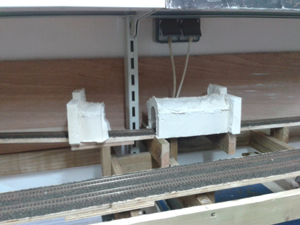 6 Exemple de pièce achevée. La voûte est peinte avec une bombe de peinture anthracite pour poêle à bois. La façade est tapissée avec des pierres de chez Région et Compagnie. Ce tunnel est celui de la gare côté nord. Je l'ai rendu démontable dans l'hypothèse de la mise en place d'une caténaire. D'autres images. |