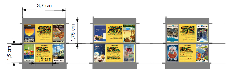 Chaque panneau fait 3,7mm de long par 1,75 de haut. L’image publicitaire fait 1,5 cm de haut avec une largeur variable. Mes planches de dessin sont téléchargeables en PDF en cliquant dessus.
