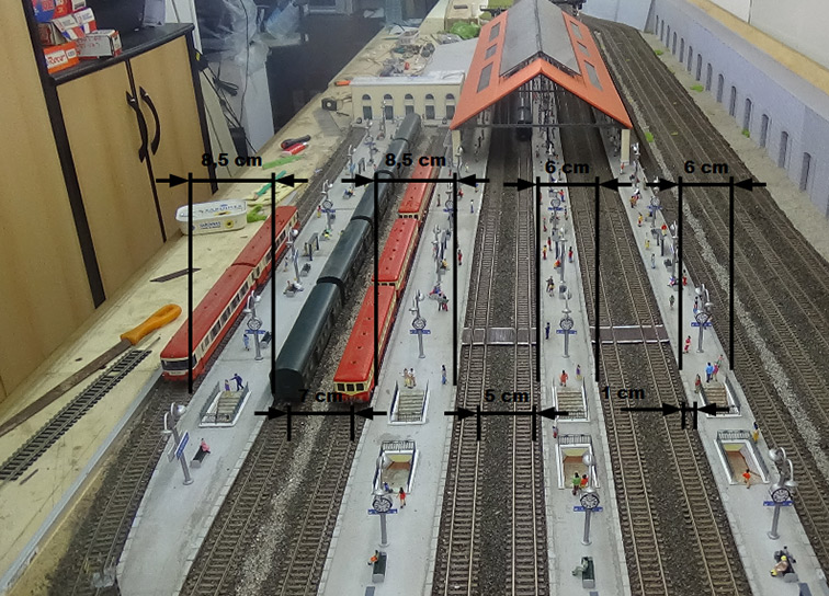 Alors j’ai décidé de faire mes quais à partir de zéro. Puisque je construit tout, mes mesures sont libres. Quai du bâtiment voyageur : 8,5 cm, souvent il est plus large que les autres. Quai centraux, 6 cm contre 5 chez Jouef. Quai de la partie en impasse, 8,5 cm déterminée par la longueur du bâtiment annexe où buttent les trois voies.