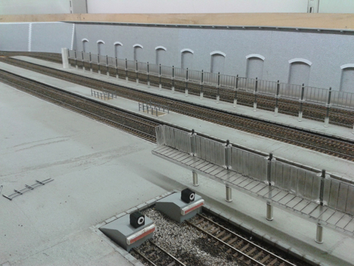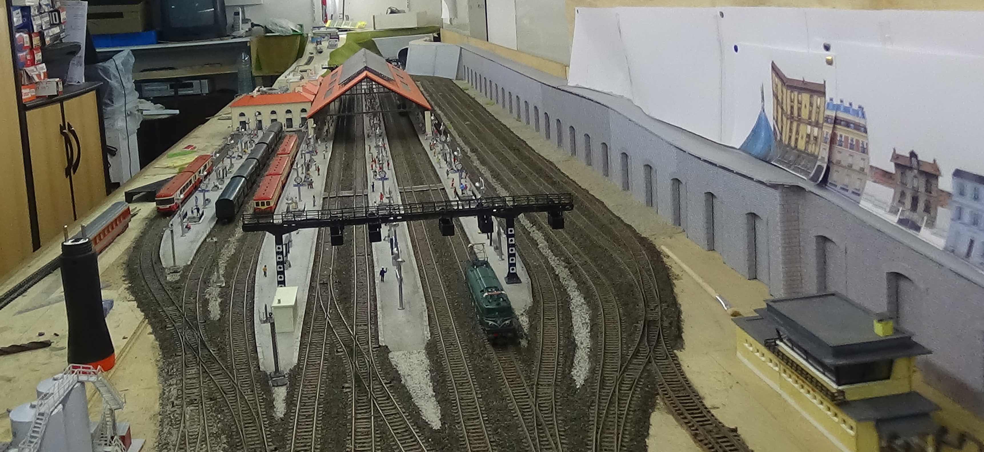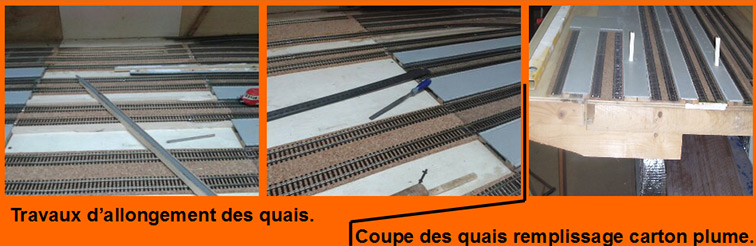 Au début de mes travaux je disposais d’un local de 6,50 m environ dont j’étais locataire. Ceci m’a permis de construire des quais de deux mètres de long, deux cinquante pour le plus long. Comme je savais que je devrais déménager un jour mon réseau, provisoirement j’ai rempli mes quais avec du carton plume de 5mm peint en gris. Cette solution permet de percer à la demande pour implanter tout accessoire comme mes supports de verrière par exemple.