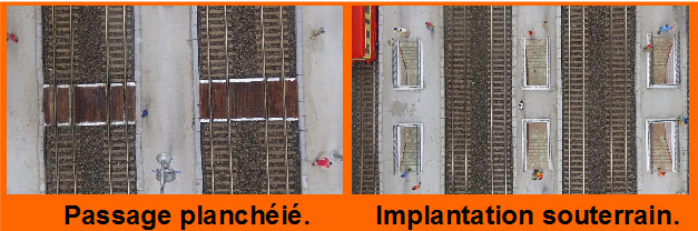 Les passages passages planchéié sont réalisés en bois de récupération de boite de fromage. Pour imiter les planches des rayures ont été faite au cutter sans trop appuyer. Avant j’ai abaissé la hauteur de la partie basse du bord de quai (carrelet) de sorte qu’une fois la bordure posée elle soit environ deux millimètre plus haut que le rail. J’ai fait cette opération avec une lime à bois fine. En fin une lasure marron a été appliquée avec une bordure blanche.