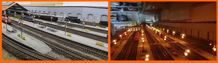 Éclairage des quais. Trente sept luminaires ont été implantés pour éclairer l’ensemble, soit environ un tous les vingt centimètres. Comme mes finances sont limitées et que les fabrication du commerce sont relativement chères j’ai entrepris ma propre fabrication en laiton. Deux modèles ont été fabriqués : un à double lampe équipé d’un panneau nom de la gare et un à double lampe équipé d’une horloge lumineuse. Des luminaires sont implantés sur le quai central sous la verrière.