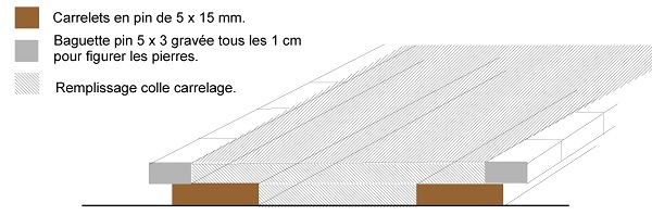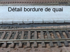 Pour faire ces quais en premier j’ai collé à la colle à bois et cloué du carrelet en pin 5 x 15 mm à 12 mm du rail extérieur. Puis ce bois a été peint en gris. Ensuite dans des baguettes de pin 5 x 3 mm j’ai gravé tous les centimètres une fente avec une lame de scie à métaux dans le but de représenter les pavés du bord de quai. Ces baguettes sont ensuite clouées et collées sur les carrelets à 1 cm du rail extérieur. Ce qui donne une hauteur de quai de 8mm. J’utilise des clous ultra-fins et pour éviter un éclatement de baguettes je perce un avant trou.