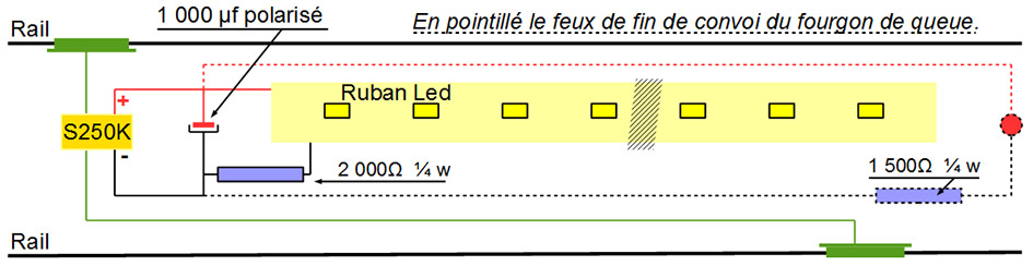 Pour ce faire j’ai besoin d’un ruban led de 12 volts, d’un pont de diodes miniature SK250K, d’un condensateur polarisé 1 000μf, d’une plaque de bronze phosphoreux de 0,15 mm d’épaisseur et de fils de câblage. Attention, le schéma si dessous est uniquement valable pour une alimentation digitale soit du courant alternatif dans les rails. Le pont de diodes redresse ce courant et le condensateur stabilise l’éclairage en cas de défaut de captage sur les rails.