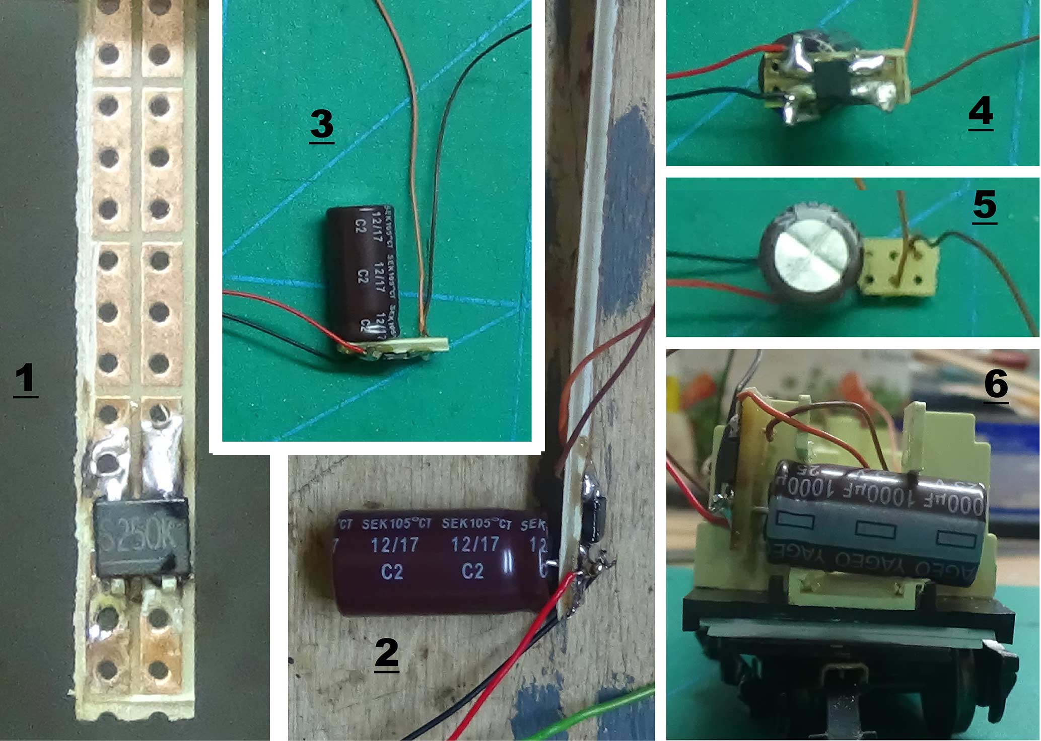 Image 3, 4 et 5. Je coupe la plaquette au raz du pont de diode et après vérification des soudures à la loupe et essai il ne reste plus qu’a mettre ce circuit en place.