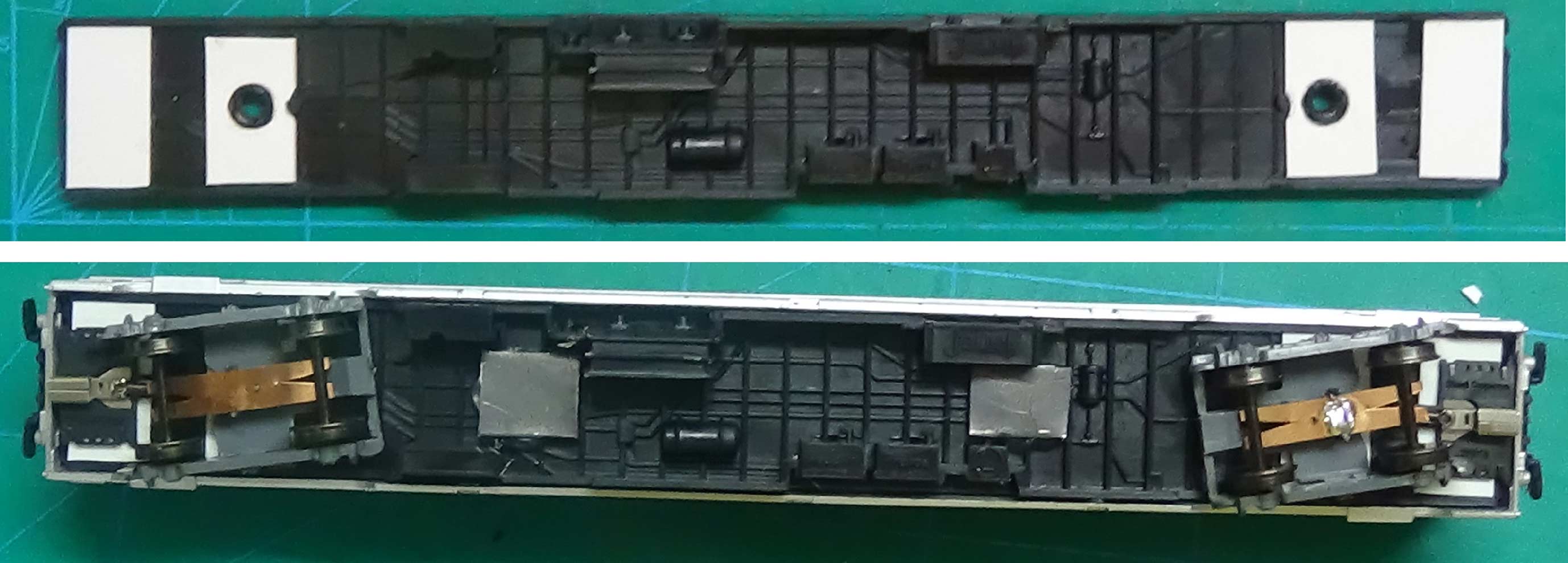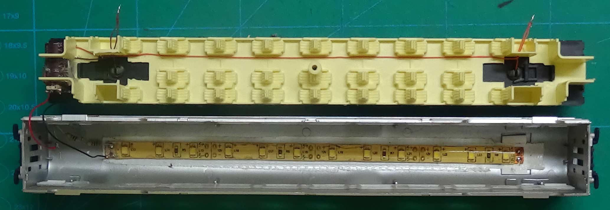 Image d’en dessous. La voiture est prête à être remontée. Le ruban à led est collé au plafond ainsi que sa résistance. Le fil qui va au bogie le pus éloigné est collé le long des sièges.