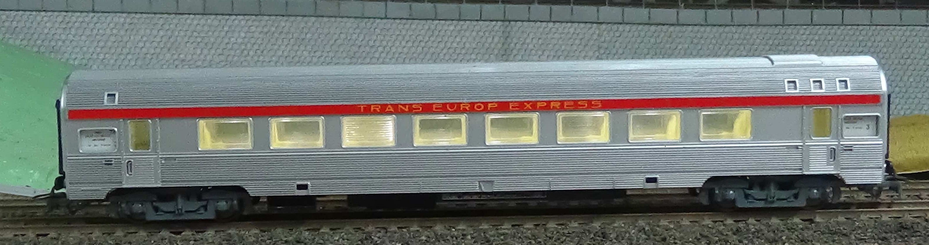 Je possède une rame Jouef Champagnole TEE PBA composée de 7 voitures Ref 864 avec aménagement intérieur ainsi que d’un fourgon générateur Ref 865. Il s’agit d’un cadeau de mon épouse pour mes 40 ans. J’y tiens donc beaucoup même si ces voitures sont un peut trop courtes. Pour tirer ces voitures je viens d’acheter la CC 40105 de Trix en version sonore : une belle machine très puissante. J’ai donc décidé d’éclairer cette rame et d’y ajouter des attelages à élongation Fang que j’ai en stock depuis plusieurs années.