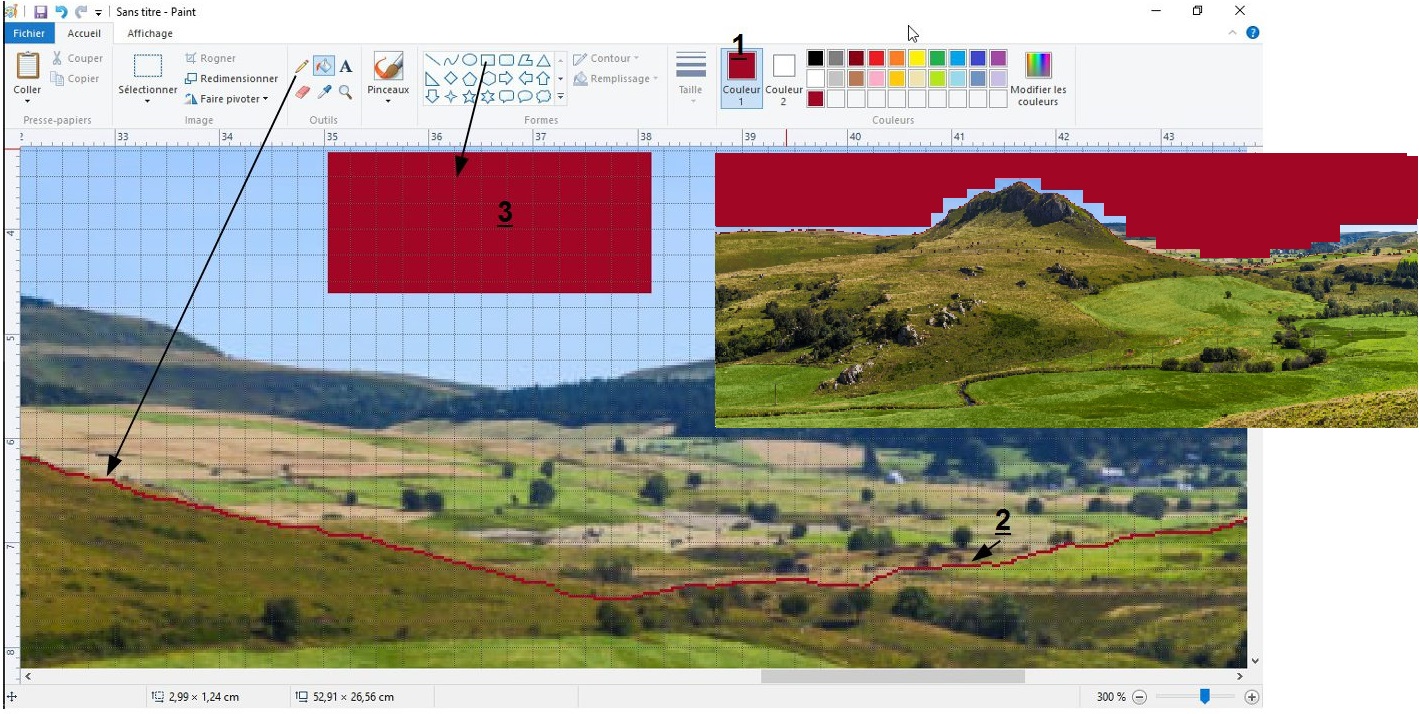 Après avoir ouvert l'image dans Paint, choisir ou fabriquer une couleur (1) qui n'est pas présente sur l'image. Ensuite avec le crayon - trait fin - vous tracez le contour de ce que vous souhaitez conserver (2). Le faire par petites actions successives et ne pas oublier qu'on peut toujours annuler l'action précédente même si elle est enregistrée. Vous dessinez un rectangle (3) que vous remplissez avec votre couleur. Vous sélectionnez une partie de ce rectangle et avec la fonction copier/coller vous remplissez la majeure partie de ce qui est à supprimer. Noter que ce travail est fait avec un zoom à 300%. Constatez aussi qu'avec Paint on peut assembler des images uniquement avec les fonctions copier (depuis un autre fichier)/coller. |
